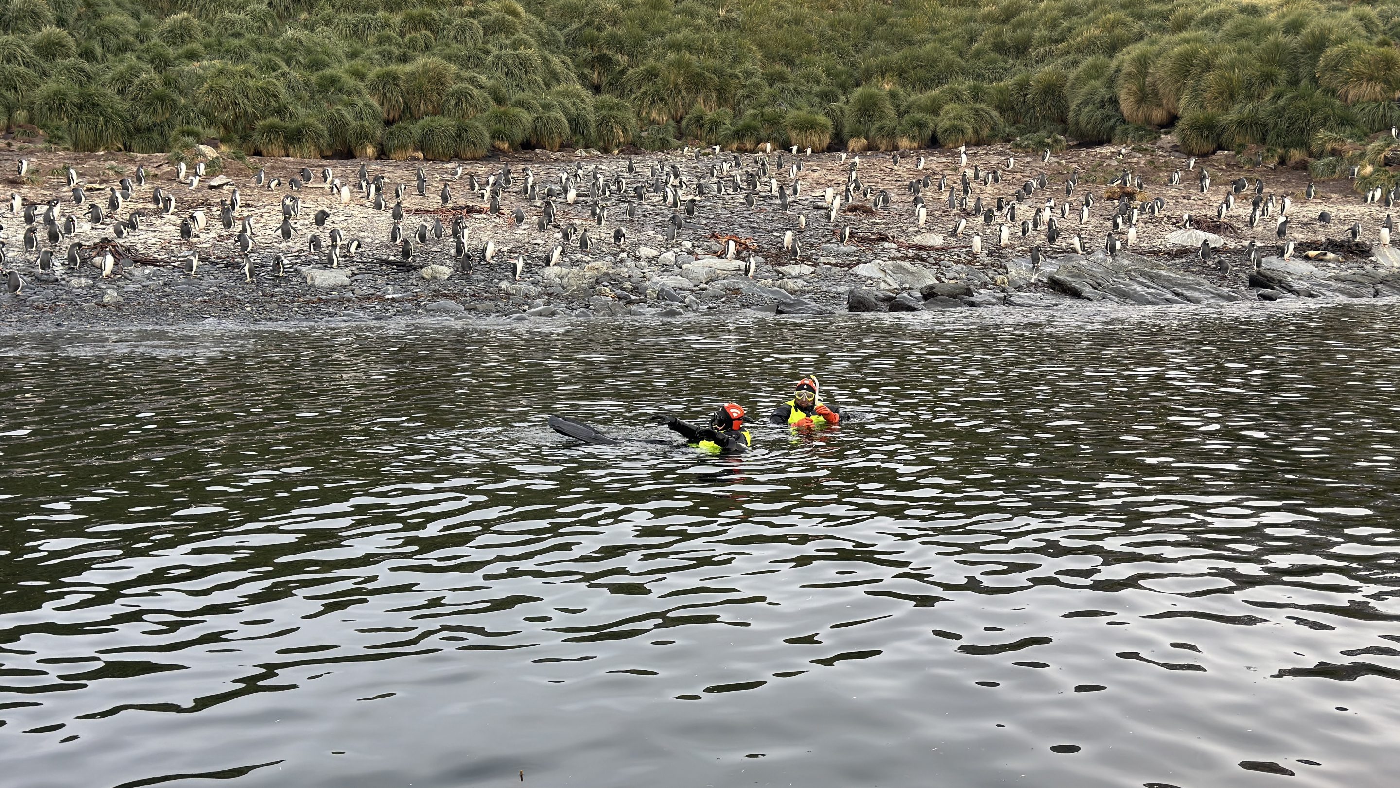 Penguins are among the most visible inhabitants of Godthul. Large numbers of gentoo penguins breed on the grassy slopes above the bay, where they build nests from stones and tussock grass. These colonies are lively and noisy, especially during the breeding season. King penguins are also present, though in smaller numbers compared with larger colonies elsewhere on South Georgia. Visitors may see them gathered on the beaches or moving between the sea and nesting grounds.